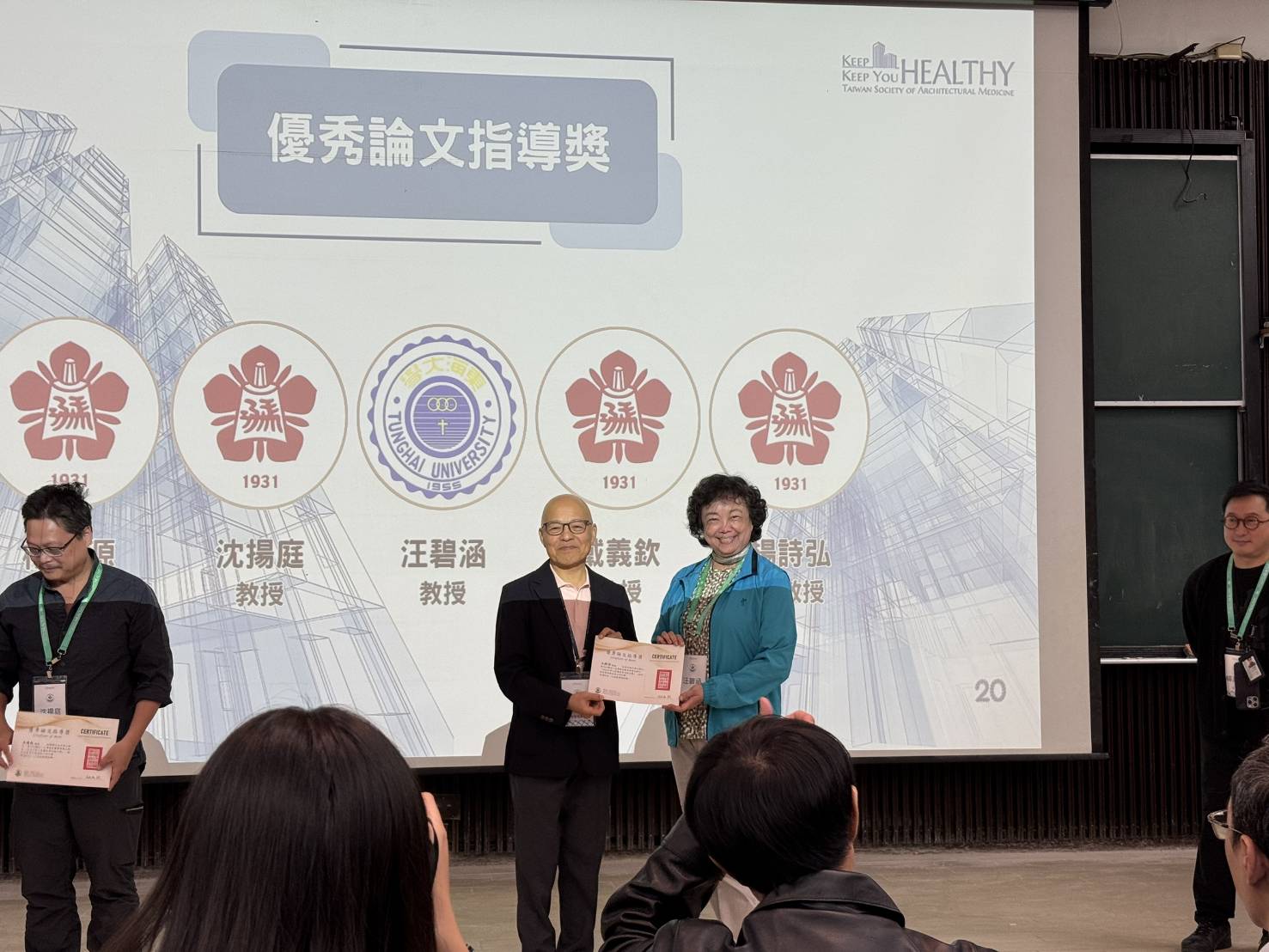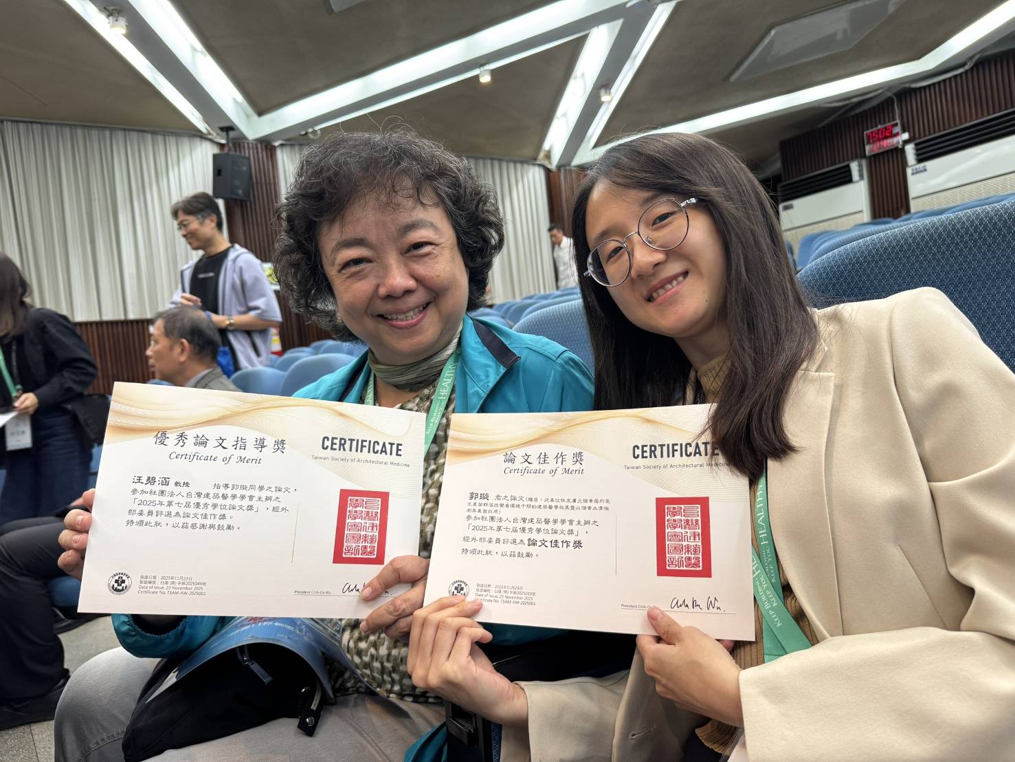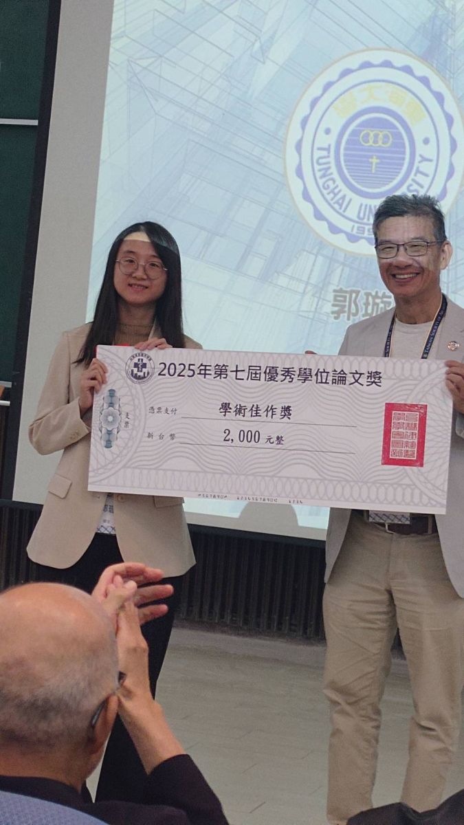 本系碩士畢業生 郭璇 參加 2025 年社團法人台灣建築醫學學會舉辦之學會論文競賽,在來自 21 所大專院校、83 位碩博士論文中脫穎而出,榮獲論文佳作獎。指導教授汪碧涵亦因指導學生之卓越研究成果而獲頒優秀論文指導獎,展現本系的研究實力。