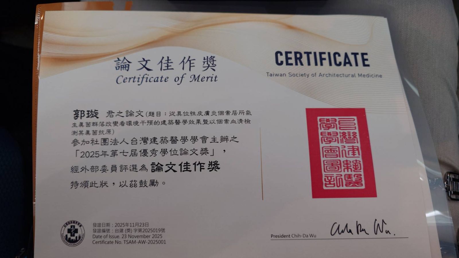 獲獎的論文為《從異位性皮膚炎個案居所氣生真菌群落改變看環境干預的建築醫學效果暨以個案血清檢測其真菌抗原》。該研究以異位性皮膚炎個案居住環境為核心,透過分析環境中氣生真菌群落於環境干預前後之變化,並結合個案血清真菌抗原檢測,從建築醫學的角度探討環境改善措施對健康狀態的影響。研究整合環境微生物、生物醫學指標與建築環境分析方法,展現跨領域研究的應用價值。