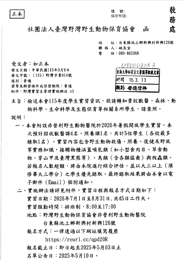 社團法人臺灣野灣野生動物保護協會115年度學生實習資訊。