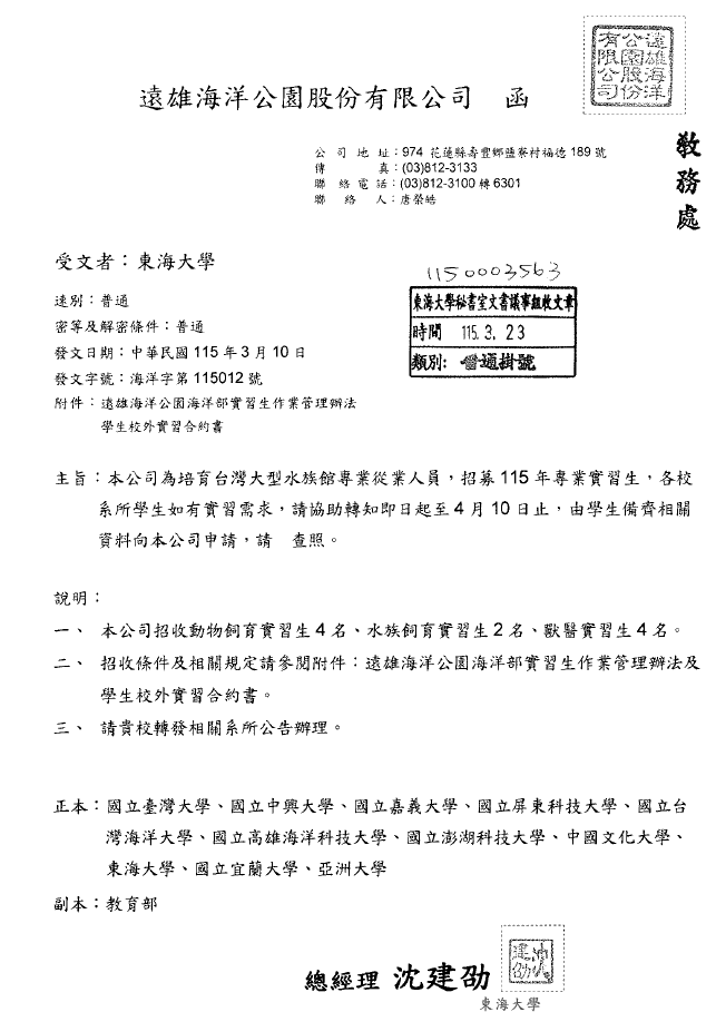 依據「遠雄海洋公園海洋部暑期實習生作業管理辦法」規定,本項實習不支付任何報酬,請各系所協助評估後協助轉知所屬學生周知,並請於期限內依規定辦理。
